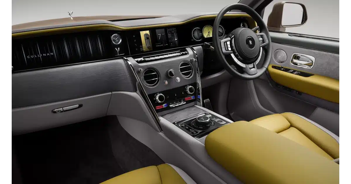 Inside, the Cullinan boasts a glass panel stretching the full width of the dashboard, housing both the digital gauge cluster and the center touchscreen. The display runs Rolls-Royce’s latest infotainment system, called Spirit, which was first seen in the electric Spectre.